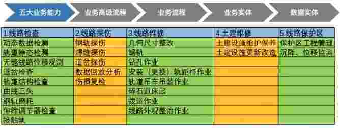 在轨道运维业务中,,,,,,,,,,我们形成了完整的从业务能力(业务域)-业务流程-业务实体-数据模型的分析梳理过程。。。。。。。。。。轨道运维业务能力如下图所示:::::::::::::