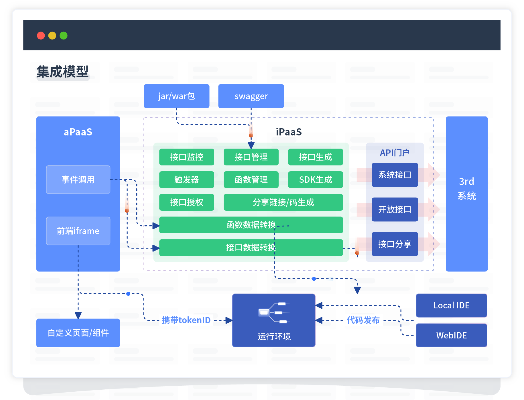 集成模型包括平台本身前、、、、、、、、、、、、、、后端能力的扩展,,,,,也支持通过API门户和第三方系统进行交互。。。。。。。。。。。