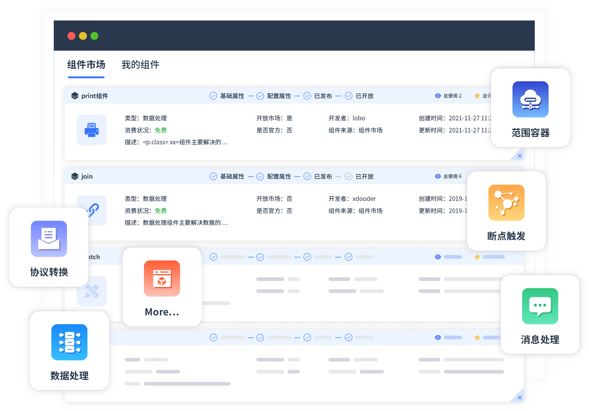 针对集成场景,,,,,小微钱包提供组件市场,,,,,,,,,,,例如协议转换、、、、、、消息处理、、、、、文件操作等。。。。。。除平台提供的组件外,,,,,,,,,,客户可以自定义所需组件。。。。。。。。