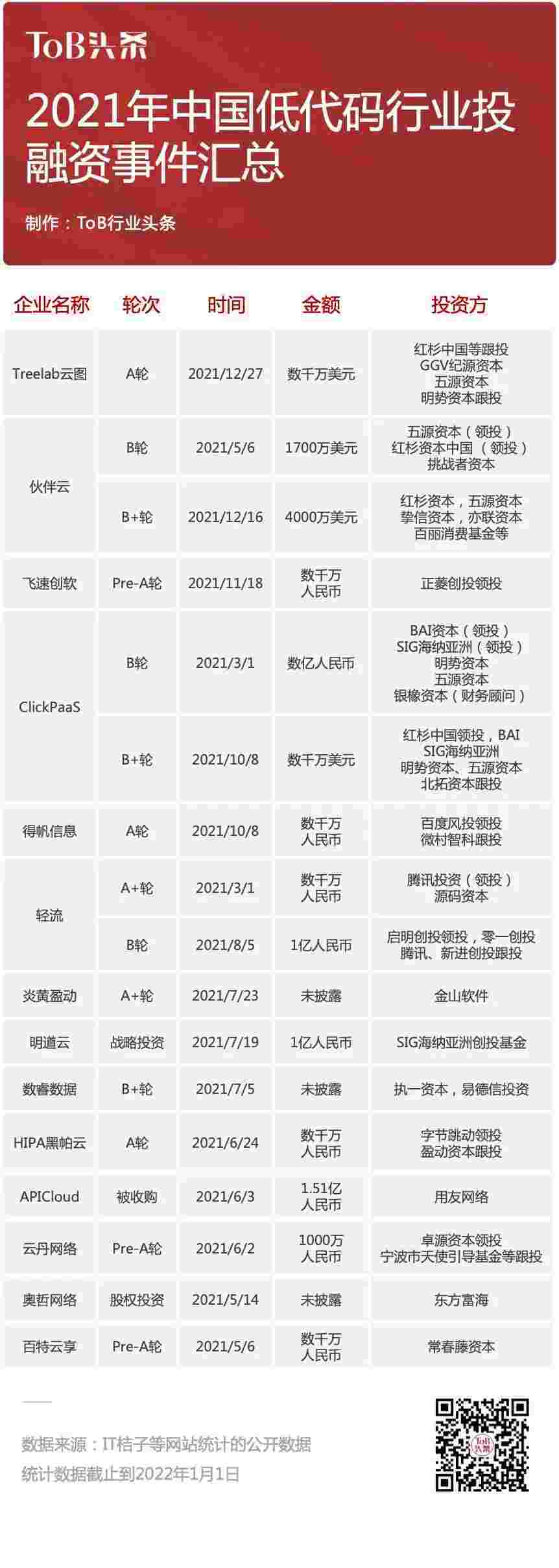 到2021年,,,,,,,无/低代码投融资规模势头更甚,,,,,,,,,,,其中包括轻流两轮融资(A+轮数千万人民币,,,,,,,,,,,B轮近亿人民币)、、、、、、、、小微钱包 两轮融资(B轮数亿人民币,,,,,,B+轮数千万美元)、、、、、、、、、、、、、百特云享数千万元Pre-A轮融资......